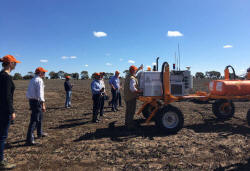 Officials observe a weed-spraying function on a robot in wheat