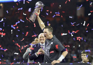 New England Patriots' quarterback Tom Brady holds the Vince Lombardi