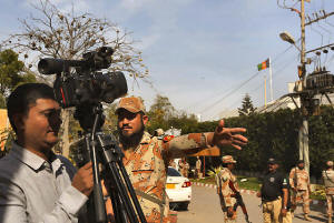 A paramilitary soldier gestures to stop a cameraman in front of the