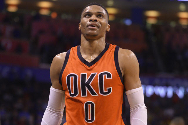 Thunder guard Russell Westbrook (0) reacts after a play against the