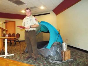 Ed Robison, a proven story teller, came to the front to share another story of the last trip to Philmont. He noted that he and Graue are both coffee drinkers, and they needed that morning Joe to get going. Because of this, they always rose a bit earlier than everyone else to get the fire going and the pot brewing. He recounted that in the wilderness there is a need to hang all the food in bags in the trees to protect it from the bears.