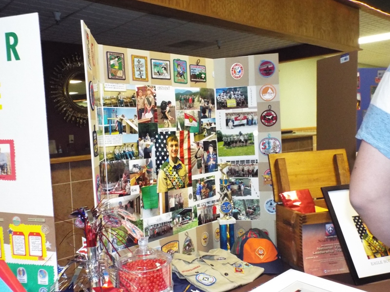 Inside the door of the banquet room long tables were set up with story boards for each of the six scout. The boards contained a collection of memories from each scout reflecting their scouting careers and their accomplishments throughout those years from Tiger Cub to Boy Scout to Eagle Scout.