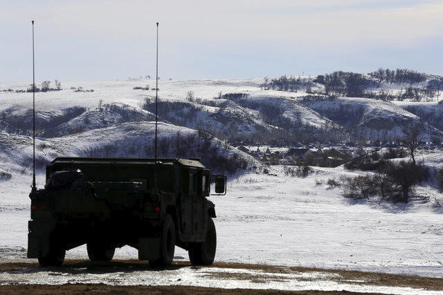 A North Dakota National Guard vehicle idles on the outskirts of the