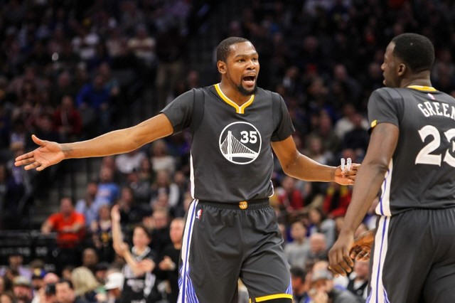 Golden State Warriors forward Kevin Durant (35) argues with forward