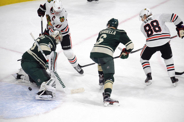 Blackhawks center Jonathan Toews (19) scores on Minnesota Wild