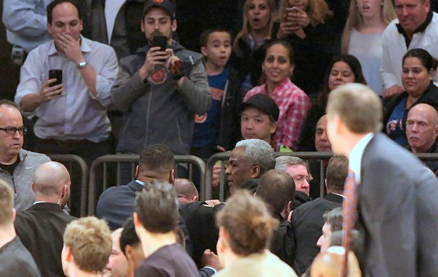from his seat by security as fans and the Knicks bench watch during