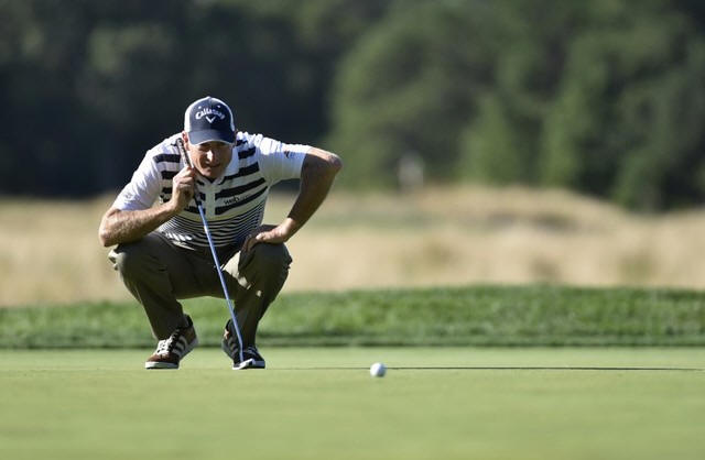 Jim Furyk reads the green on the 10th hole during the first round of