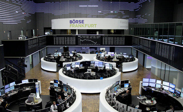 Traders work at their desks in front of the German share price
