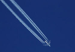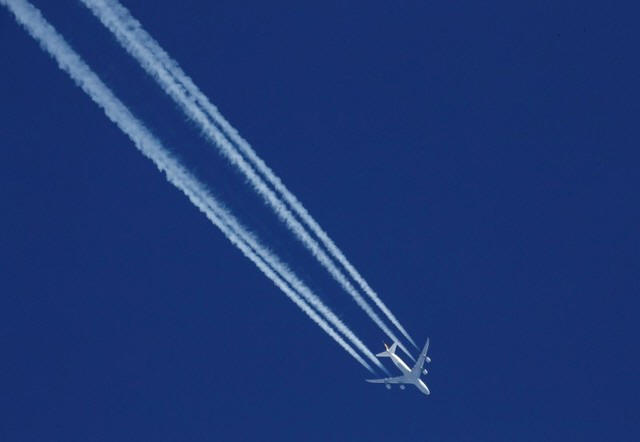 Vapour trails from a Lufthansa plane are seen in the sky over the
