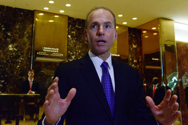 Dennis Muilenburg, CEO of The Boeing Company, speaks to members of