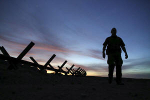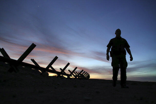 U.S. border patrol agent Alessio Faccin walks along the border fence