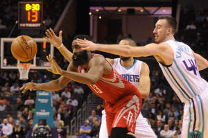 Harden (13) passes the ball as he is defended by Charlotte Hornets
