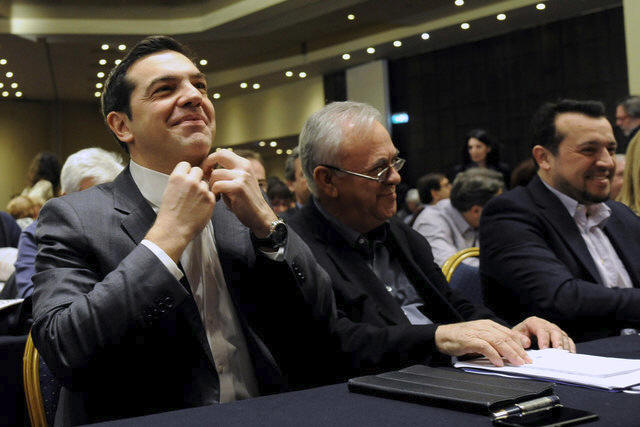 sits next to Deputy Prime Minister Giannis Dragasakis (C) and