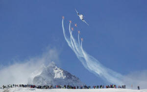 formation with a Swiss Bombardier CS100 over the men's Alpine Skiing