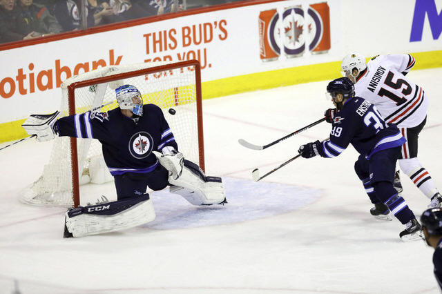 Blackhawks center Artem Anisimov (15) puts the puck past Winnipeg