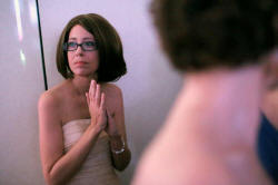 Adjusting her chestnut-colored wig in front of the mirror in her