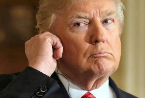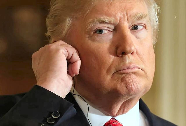 President Donald Trump listens to a translation during a joint news