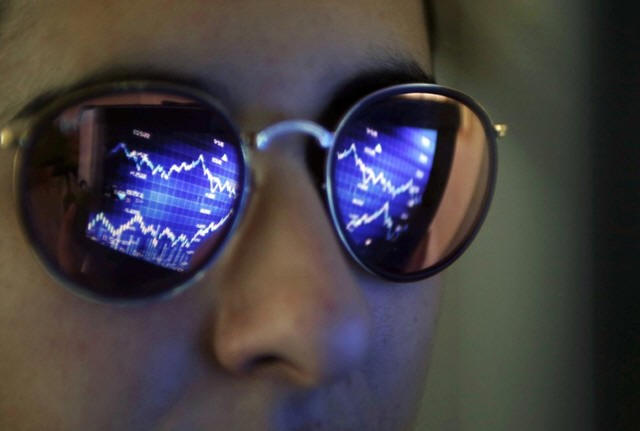 A computer screen showing stock graphs is reflected on glasses in