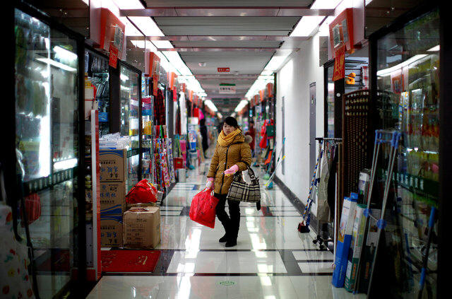 A woman pauses as she shops at a wholesale market in Yiwu, Zhejiang