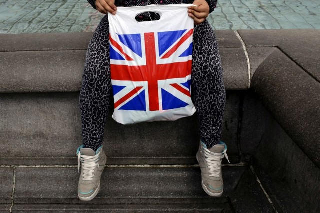 A woman holds a Union Flag shopping bag in London, Britain April 23,