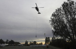 A helicopter takes off with a load of rocks to haul to the Lake