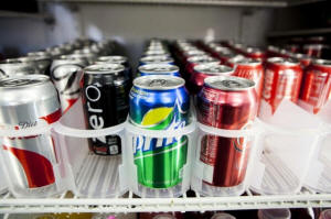 Cans of soda are displayed in a case at Kwik Stops Liquor in San