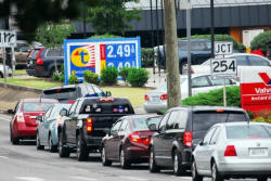 Vehicles wait in line for gas at a Twice Daily gas station on