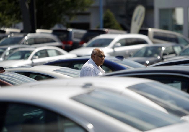 A potential car buyer looks at vehicles on a lot in Silver Spring,