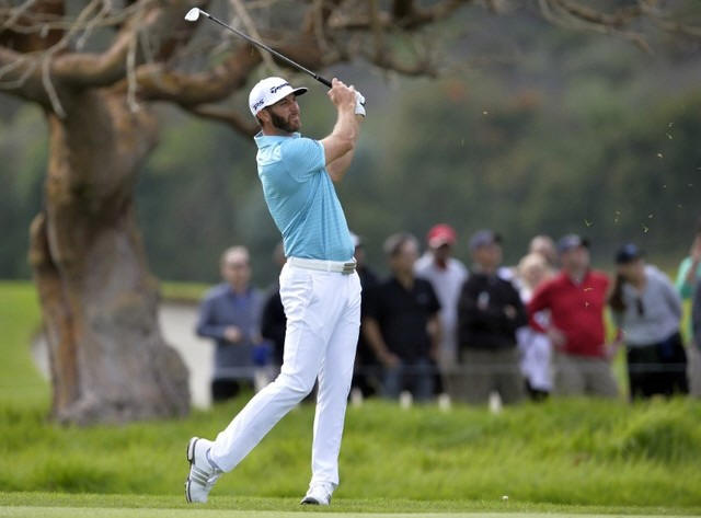 Dustin Johnson hits from the ninth hole fairway during the first