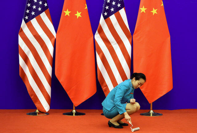 An attendant cleans the carpet next to U.S. and Chinese national