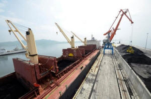 A cargo ship is loaded with coal during the opening ceremony of a