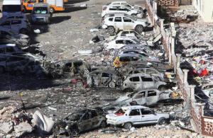 Damaged cars are seen after Friday's explosion outside a housing