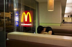 A man sleeps at a 24-hour McDonald's restaurant in Hong Kong, China