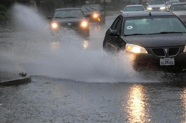 Cars drive through heavy rain in Los Angeles, February 17, 2017.