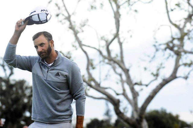 Dustin Johnson reacts after making his putt on the eighteenth hole