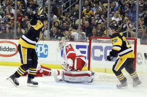 center Sidney Crosby (L) reacts after scoring a goal against Detroit