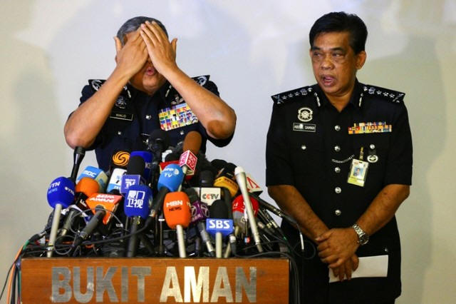 Malaysia's Royal Police Chief Khalid Abu Bakar demonstrates to the