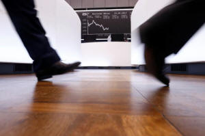 A trader walks past the German DAX Index board on the trading floor