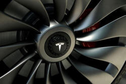 A wheel of a prototype of the Tesla Model 3 on display in front of