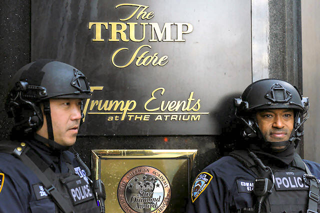 Heavily armed New York City Police (NYPD) officers stand guard in