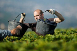 Grape pickers fill boxes with grapes at a vineyard during the