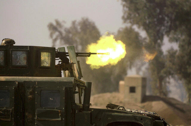 Members of the rapid response forces fire a heavy machine gun during