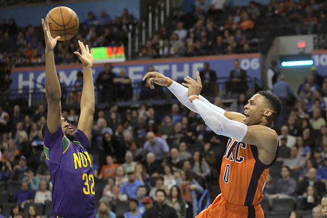 Thunder guard Russell Westbrook (0) passes the ball over New