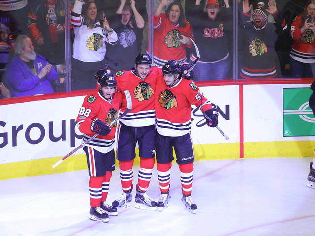 goal with right wing Patrick Kane (left) and defenseman Trevor