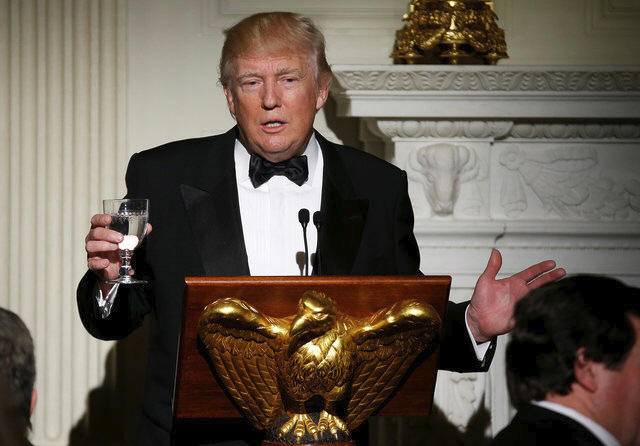 President Donald Trump makes a toast during the Governor's Dinner in