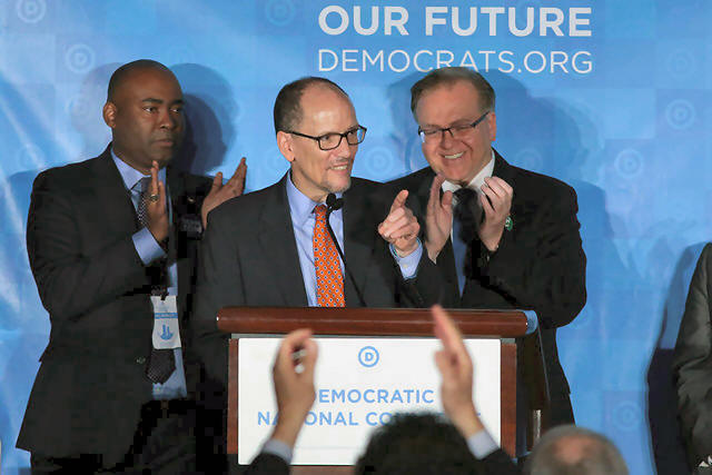 Tom Perez addresses the audience after being elected Democratic