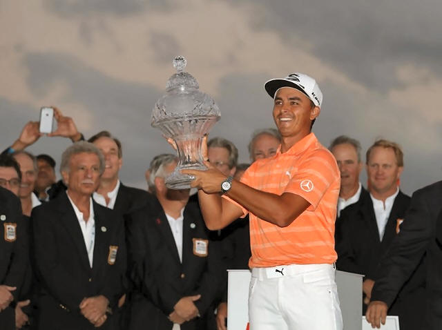 Rickie Fowler celebrates with the trophy after winning The Honda