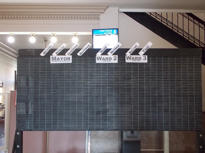 The Logan County Courthouse rotunda is prepared with the old election night chalkboard having been brought out. High voter counts are anticipated and a big crowd is expected to turnout on Tuesday evening to watch the board as the precinct tallies roll in.