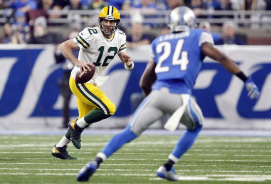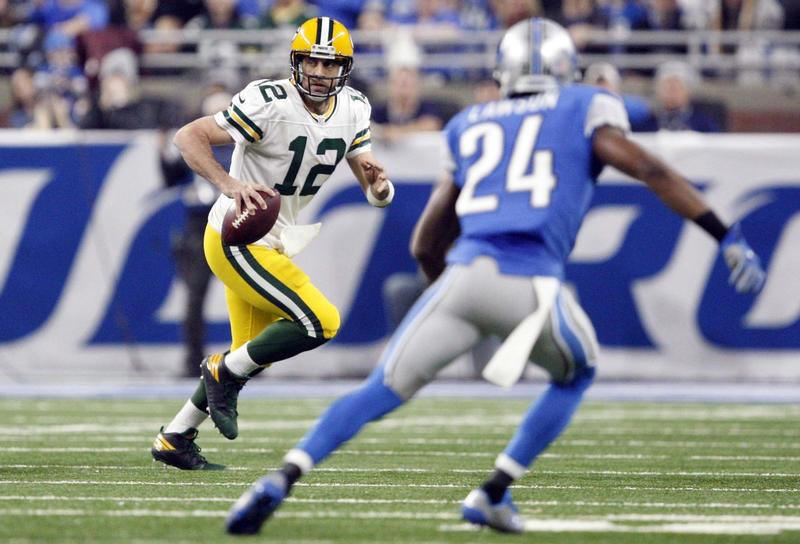 Bay Packers quarterback Aaron Rodgers (12) looks for an