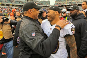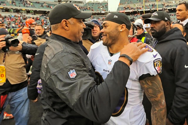 Bengals head coach Marvin Lewis (left) hugs Baltimore Ravens wide